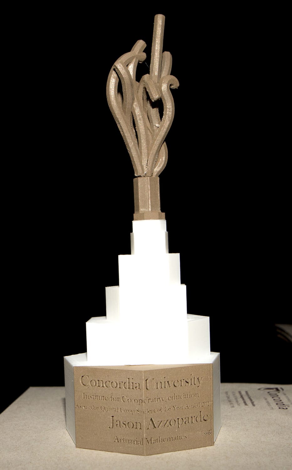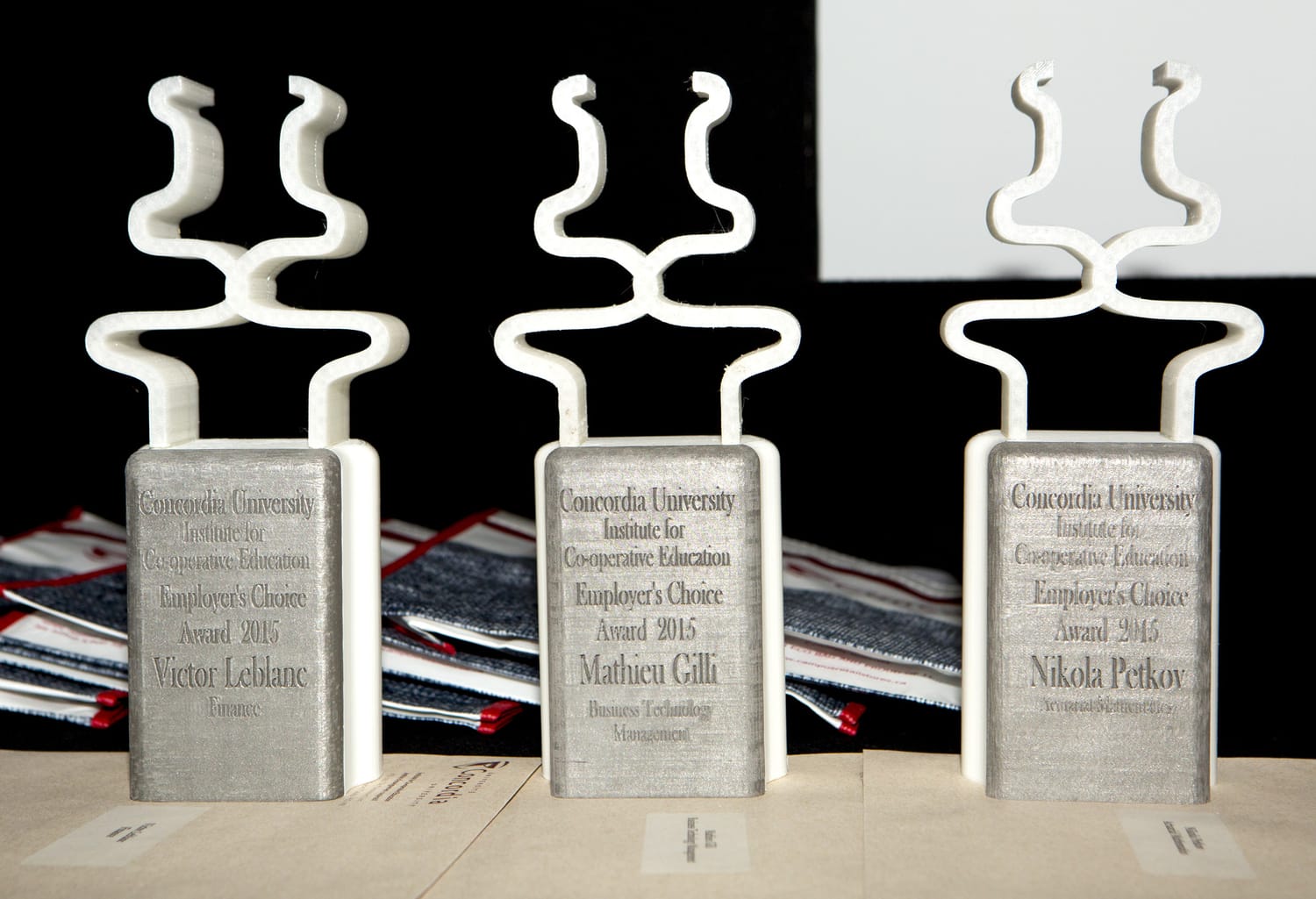 MatterThings was commissioned to manufacture 11 unique trophies for the Annual CARE 2015 ceremony at Concordia University’s Institute for Co-operative Education in Montreal. Designed by Cesar Rezer (Bachelor of Fine Arts, Major in Design), these awards required a high level of precision and material expertise.